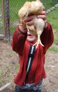 “I’ll get them,” said Bob, when I announced the chicks had to leave their torture box. Swooping, cornering, grabbing them one by one, he was plucky. The boy who hates blood fastened his quick five-year-old hands around the torso of the Pecked One, not in the least phased by the gunky bits of flesh hanging off her back.