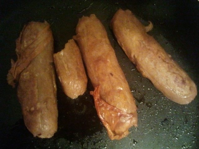 As I looked at them, swollen, peeling and bobbing about on top of the water I tried to explain that being a Friday I had had some wine and the sausages were frozen so I thought I would boil the bejesus out of them first before frying them but because of the wine I had forgotten about them for a wee bit so they were looking a little nasty.